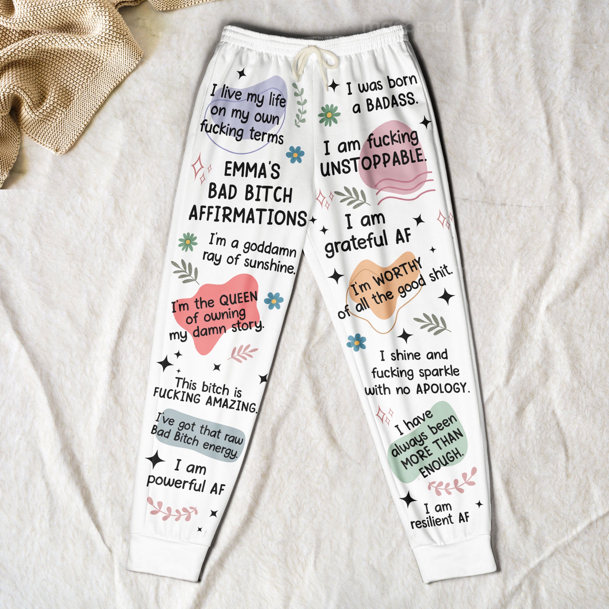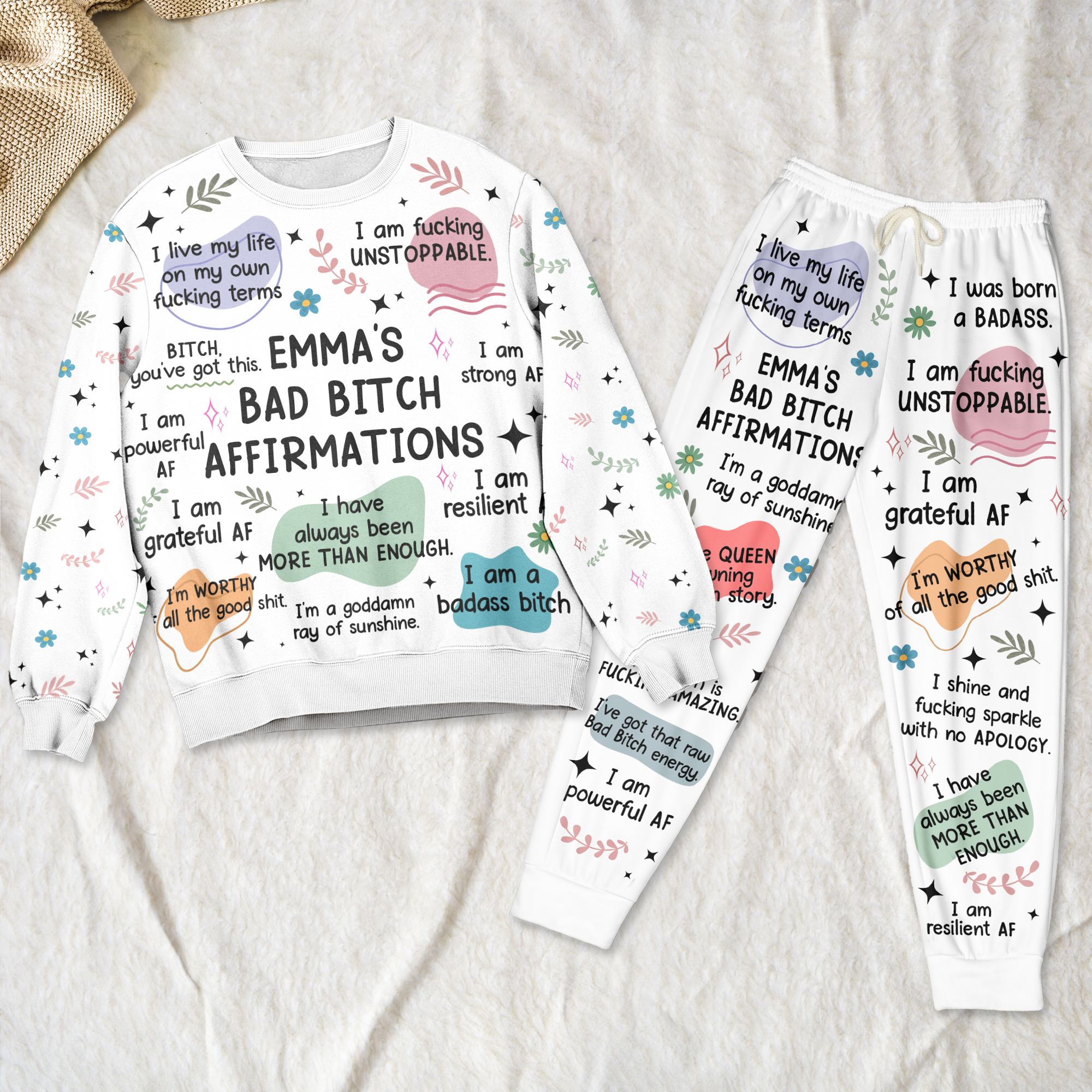 Step into comfort and confidence with this Custom Affirmation Sweatshirt and Sweatpants Set. Featuring bold phrases like “I am powerful AF” and “I am queen of owning my story,” this matching set is designed to inspire strength, self-love, and unapologetic positivity. Made from soft, high-quality fabric, it offers a cozy, relaxed fit that’s perfect for lounging or running errands in style.