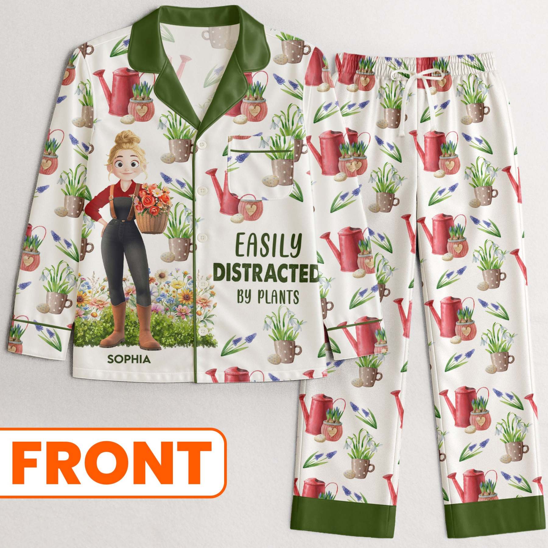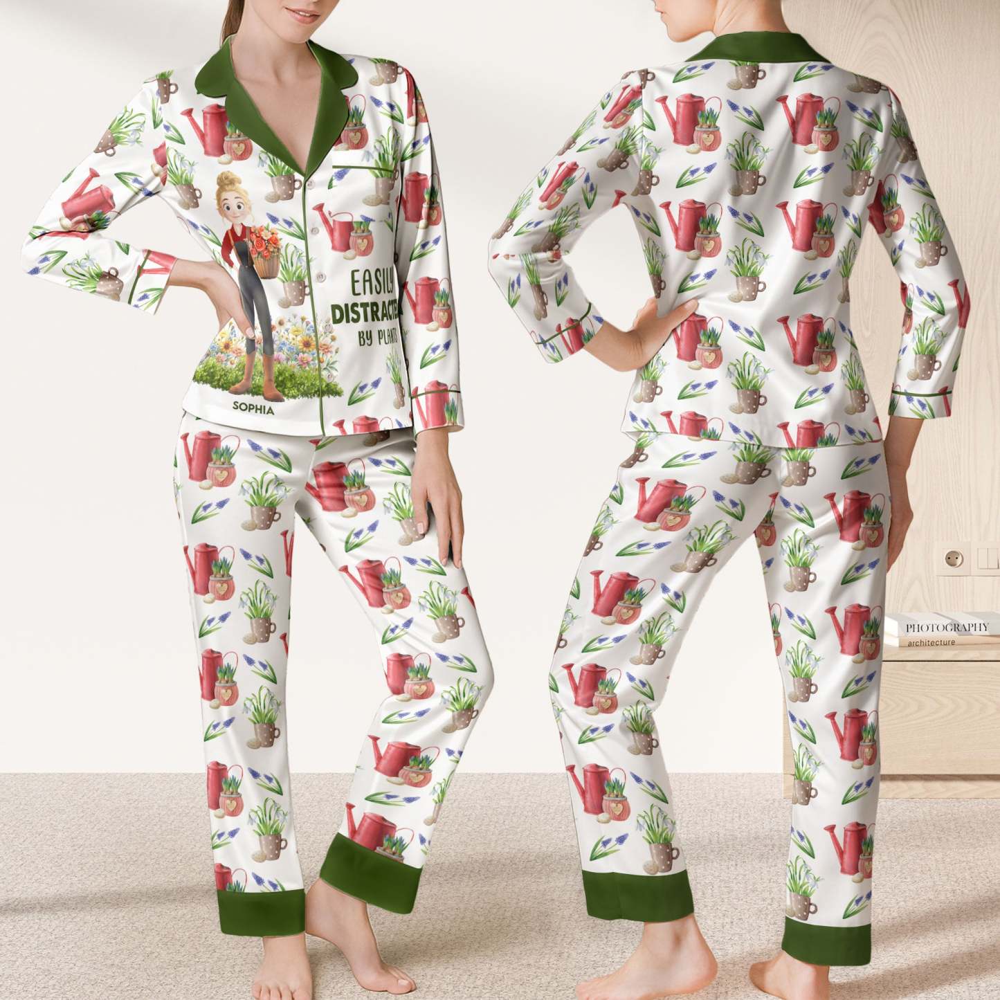Immerse yourself in the world of lush greenery even in your dreams with our 'Easily Distracted By Plants' Satin Pajama Set. This comfy and stylish set is perfect for those who are passionate about gardening and nature. Its subtle message serves as a nod to your green fingers, bringing a touch of whimsy and individuality to your sleepwear collection.