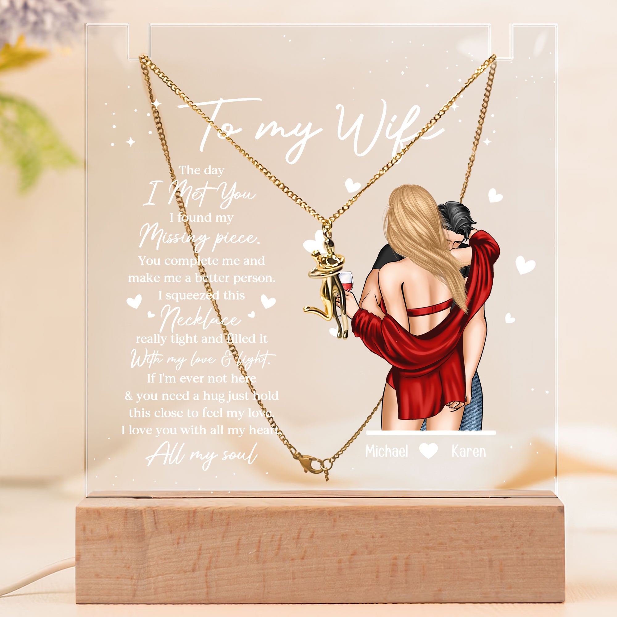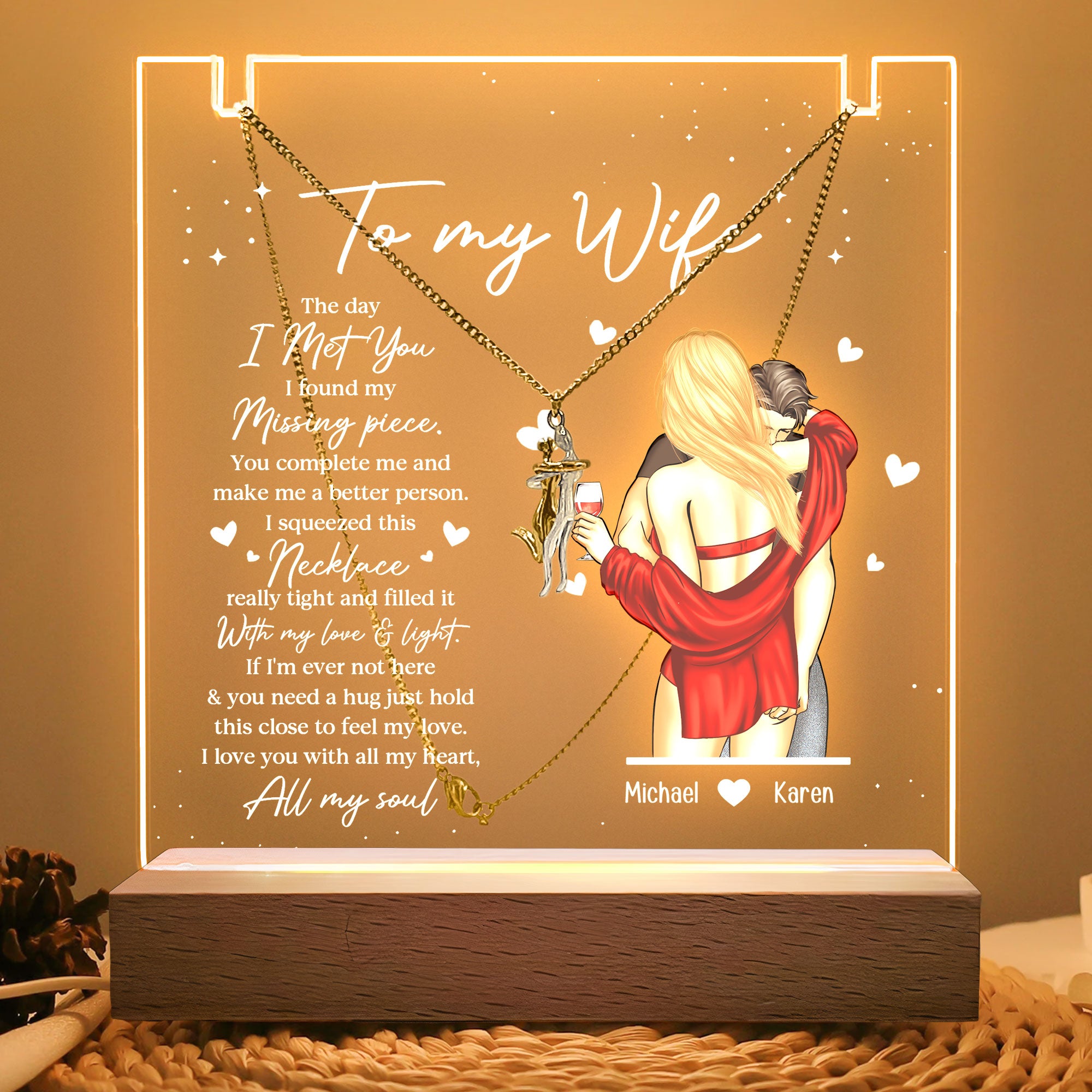 Crafted with high-quality materials to ensure a gift that lasts a lifetime, it is available in both gold and silver. Additionally, the necklace comes with a customizable LED Light Acrylic Plaque, allowing you to personalize it with quotes, characters, and the names of you and your lover, adding a personal touch to your gift. This versatile gift is ideal for any special occasion, making it a timeless and memorable present. Make your gift truly unique by personalizing it with your special message and your names, creating a lasting memento of your love.