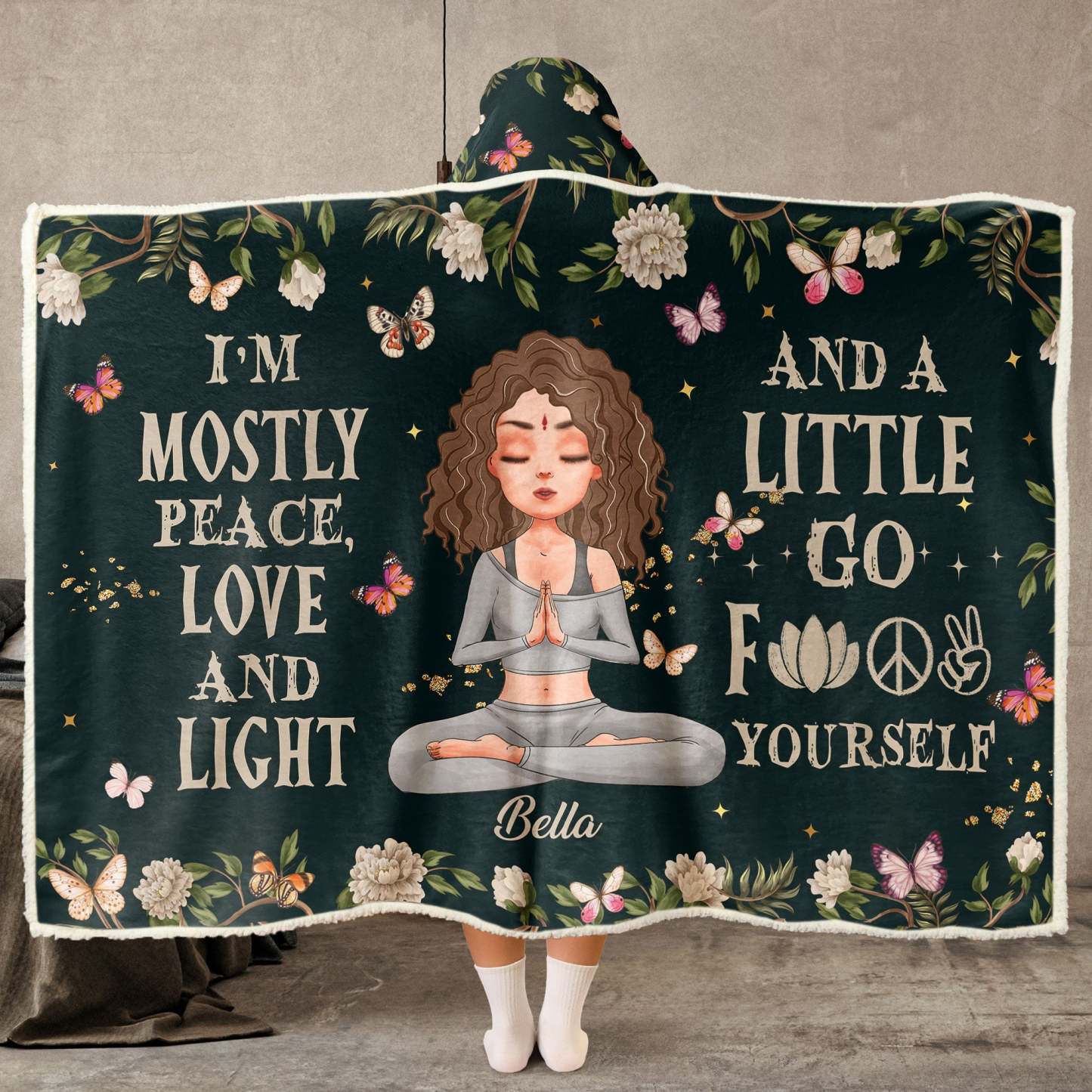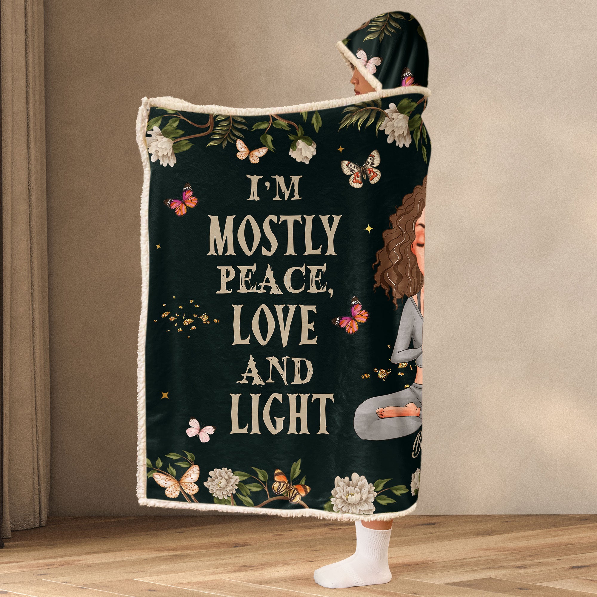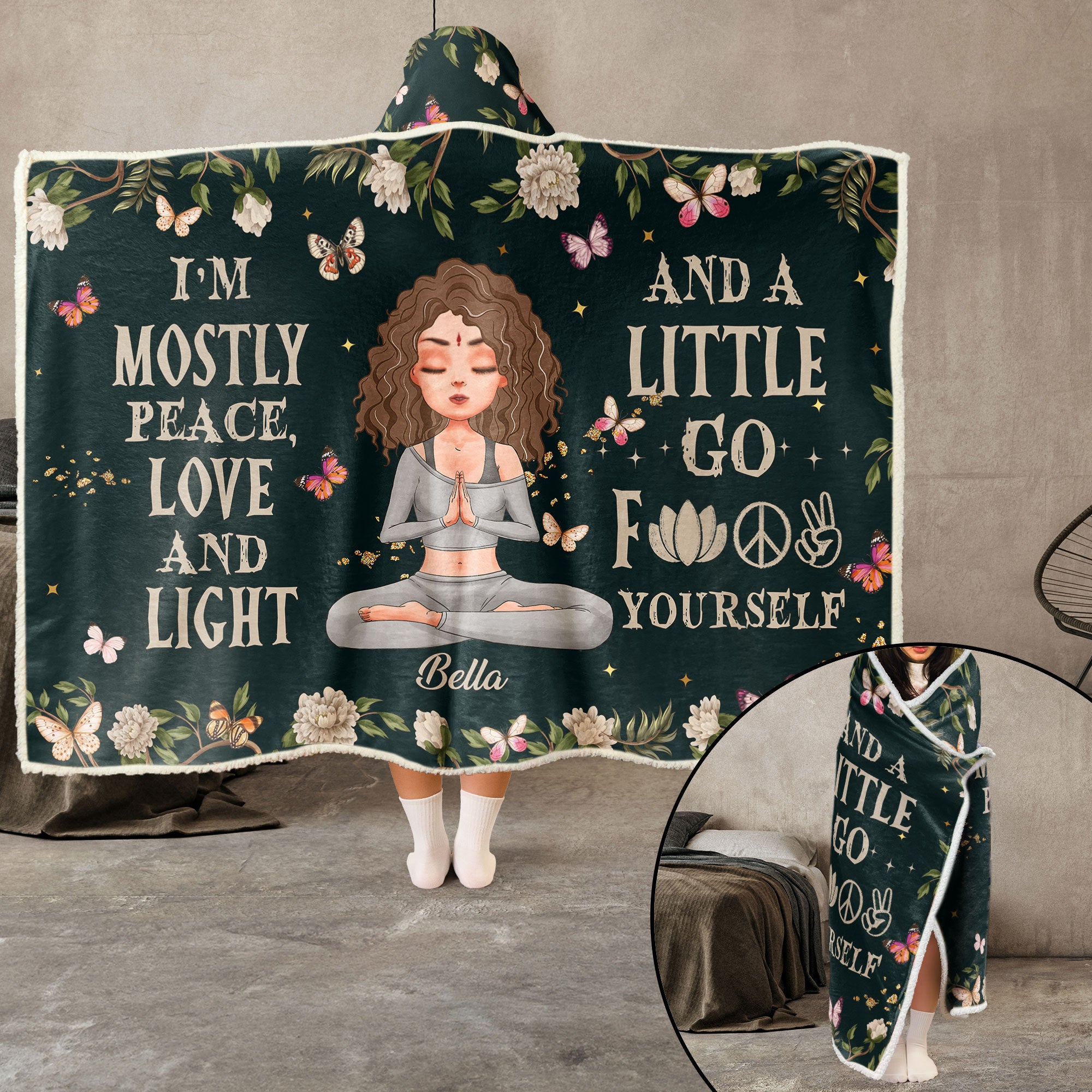 Ideal for yoga lovers, meditation enthusiasts, or anyone who loves a good laugh while manifesting good vibes, this blanket is more than just cozy—it's a statement! Perfect for birthdays, Christmas, or just because, it wraps you in warmth and a bit of cheeky motivation. Stay snuggled, stay sassy, and let the world know you’re mostly peace, love, and a little bit fierce.