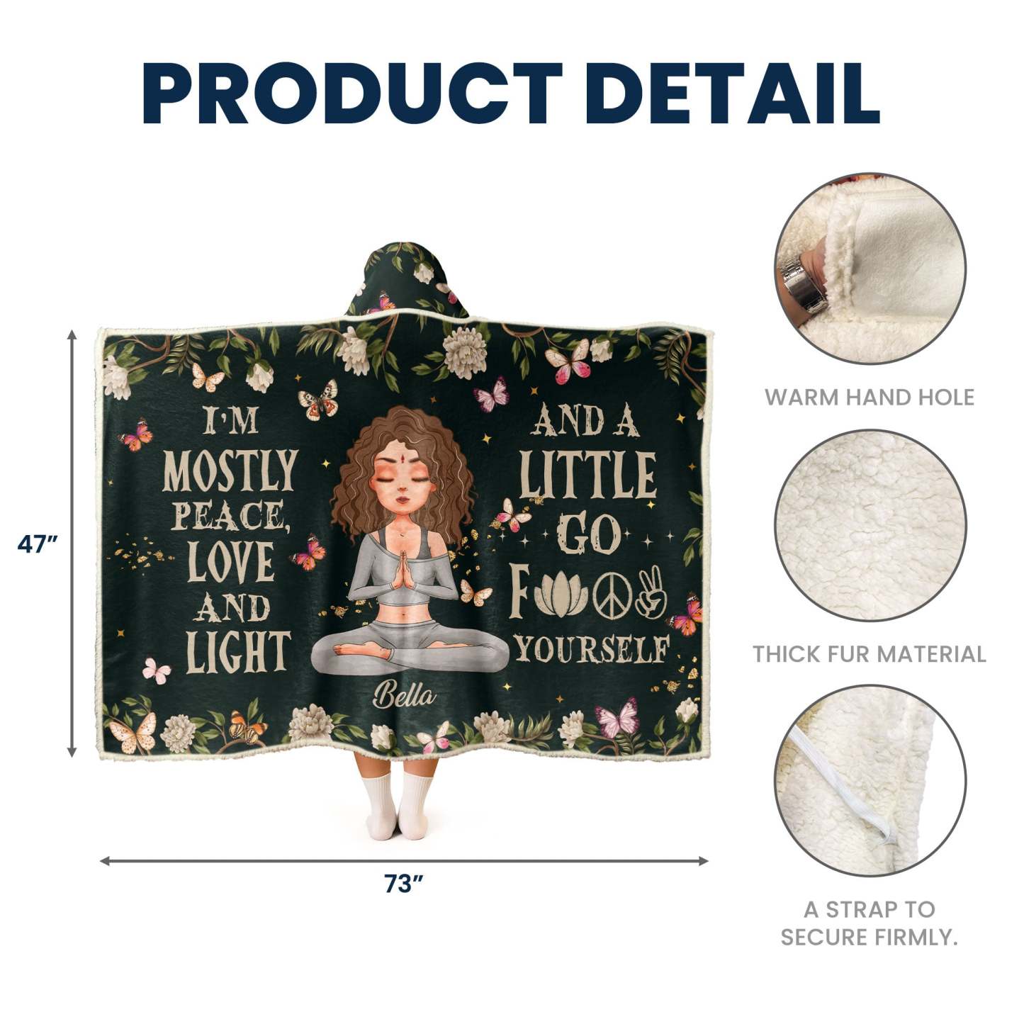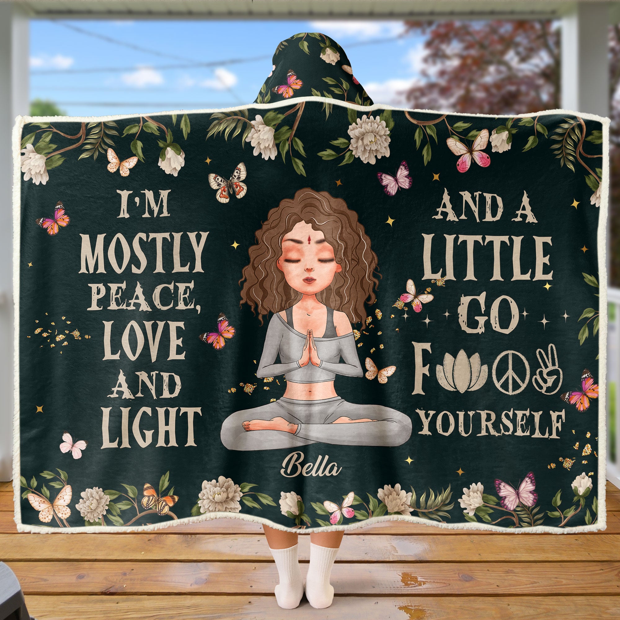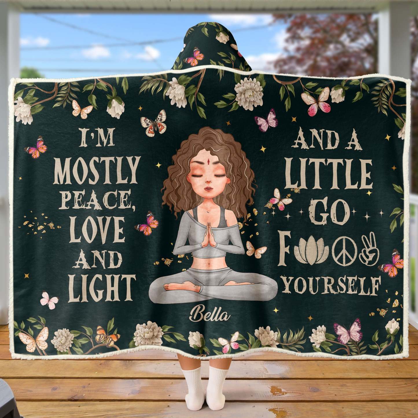 Ideal for yoga lovers, meditation enthusiasts, or anyone who loves a good laugh while manifesting good vibes, this blanket is more than just cozy—it's a statement! Perfect for birthdays, Christmas, or just because, it wraps you in warmth and a bit of cheeky motivation. Stay snuggled, stay sassy, and let the world know you’re mostly peace, love, and a little bit fierce.