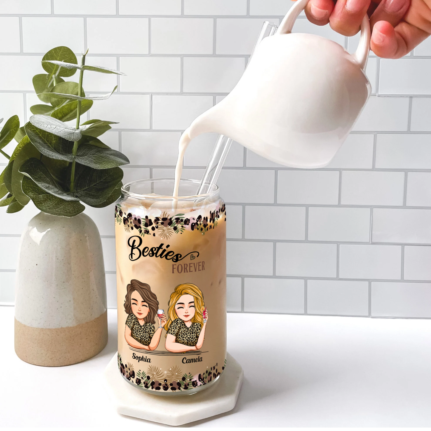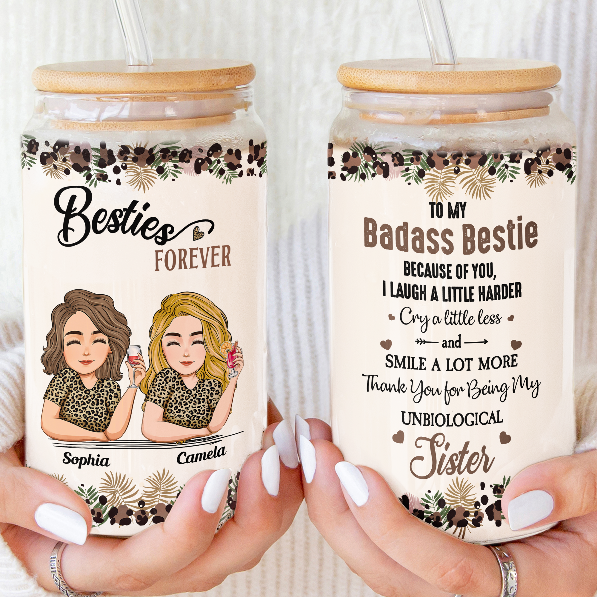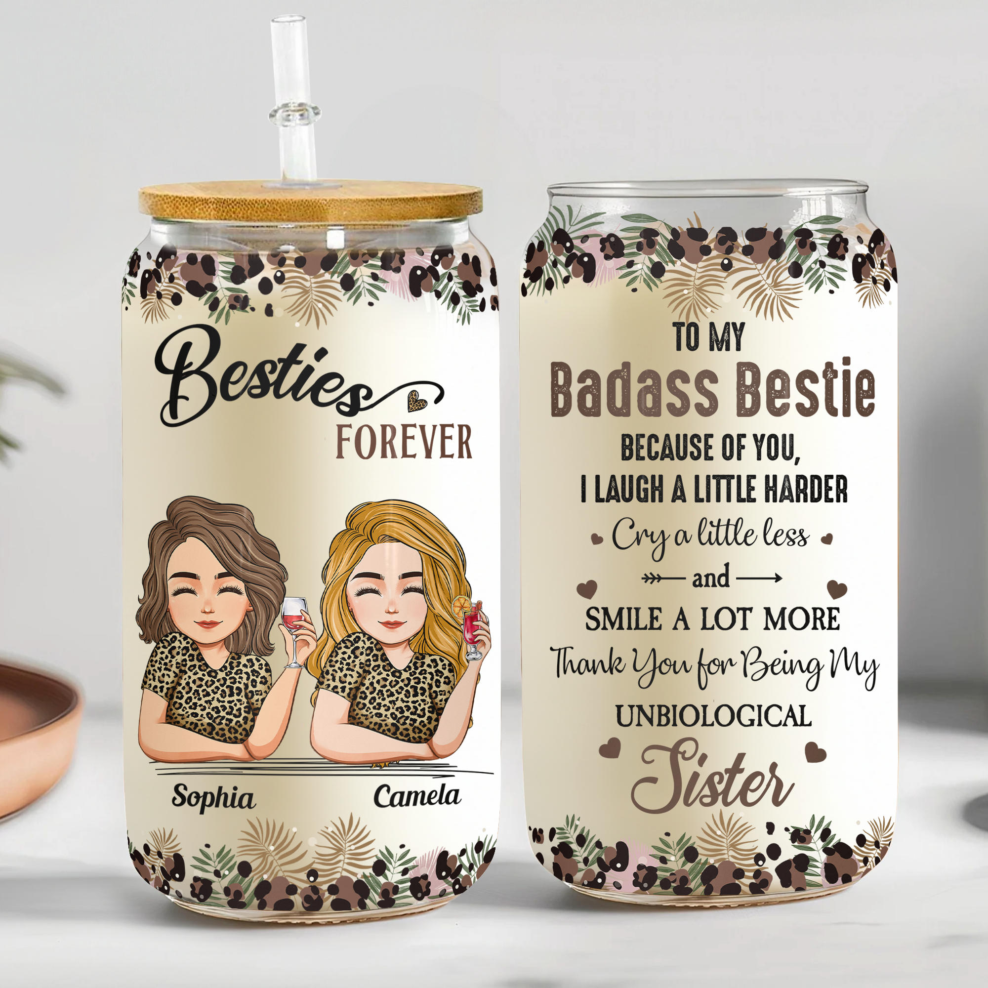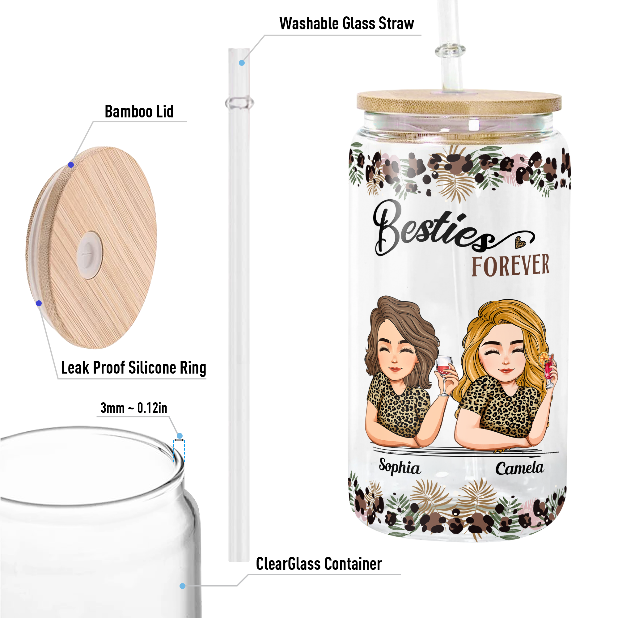 This personalized friendship clear glass cup is a hilarious gift for your best friend, BFF, or soul sisters! It includes a lid and straw for convenient use, and its glass texture adds an extra touch of elegance. You can personalize every character printed on the cup to make it extra special for your group. It's perfect for friends who enjoy laughter, drinks, and fun. Suitable for any occasion, whether it's a birthday, summer vacation, girls' trip, or road trip!
